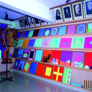 pigeon-holes for the students to keep their books and bags, comfortable desks to